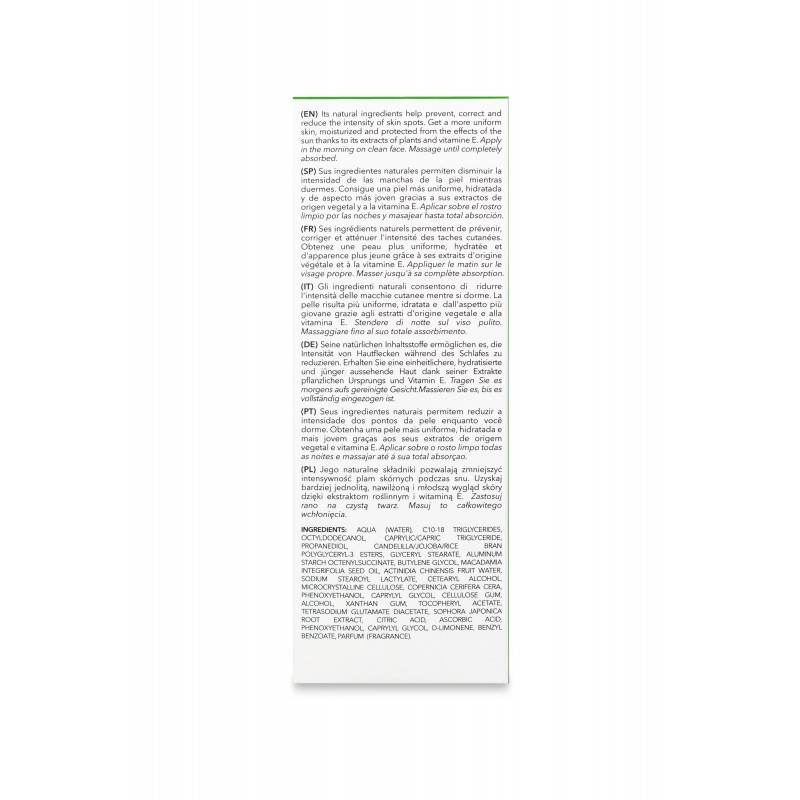 Su novedosa formulación incorporaingredientes de última generación de origen vegetal como el extracto de raíz de Sophora flavescens asiática o el Agua de kiwi. Sus ingredientes naturales permiten corregir y atenuar la intensidad de las manchas de la piel mientras duermes. Ala mañana siguiente, consigue una piel hidratada y uniforme gracias a sus activos despigmentantes de origen vegetal.