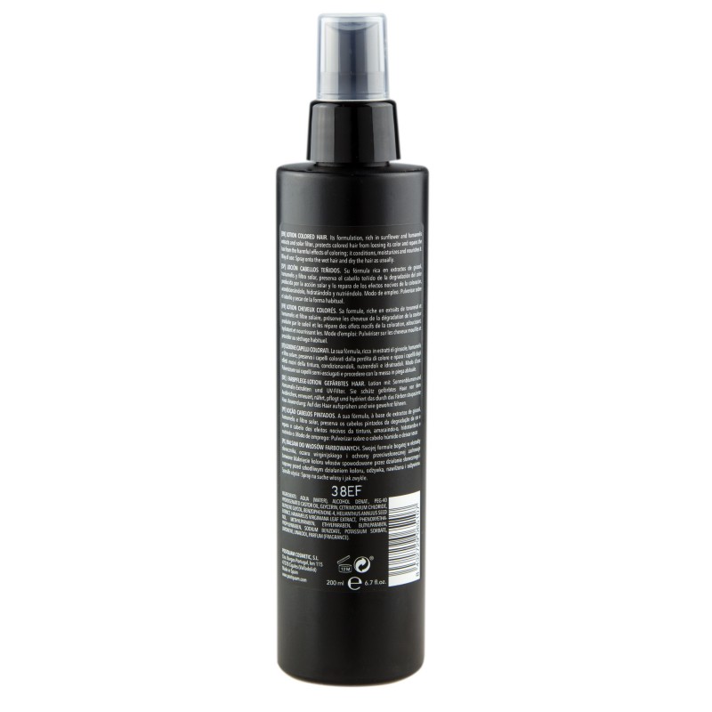Su fórmula, rica en extractos de girasol y hamamelis y filtro solar, preserva el cabello teñido de la degradación del color producida por la acción solar y lo repara de los efectos nocivos de la coloración, acondicionándolo, hidratándolo y nutriéndolo.
